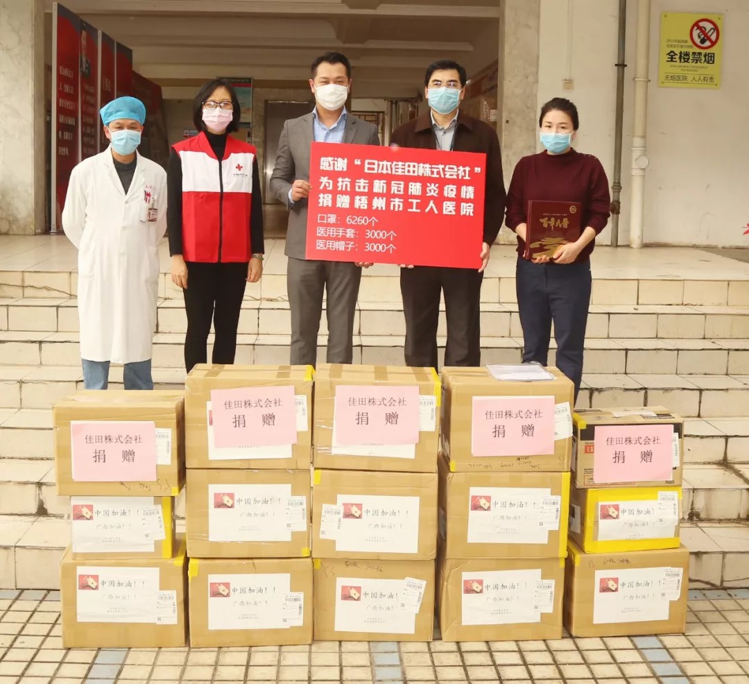(2月14日,日本佳田株式会社捐赠6260个一次性口罩、3000个医用帽子和3000个医用手套)