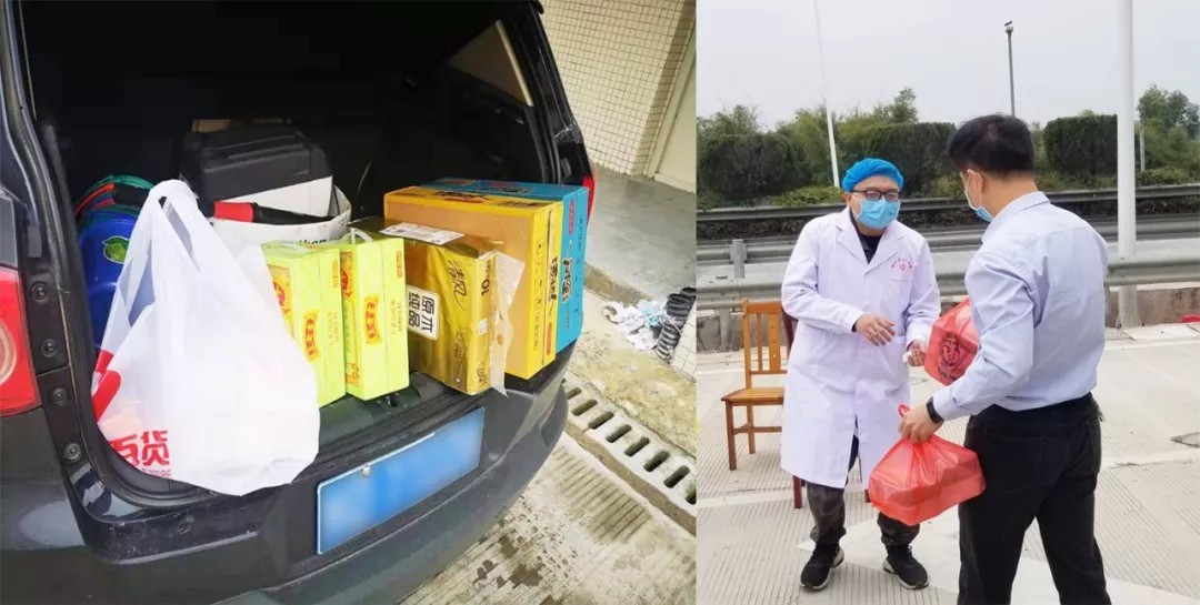 (热心市民为驻守大坡检测点的医务者送上方便面、盒饭等物资)
