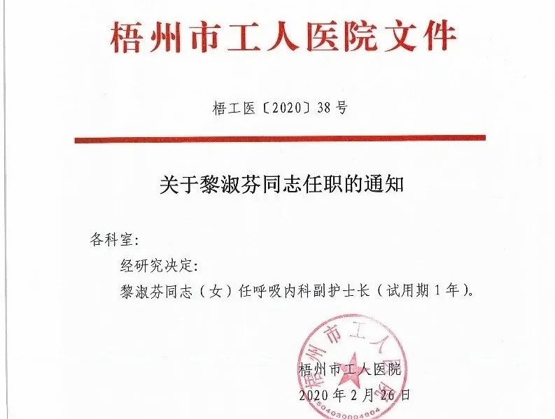 2月26日,黎淑芬被提拔为呼吸内科副护士长