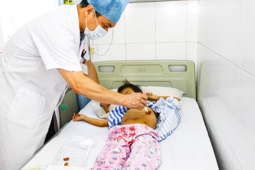近日,梧州市工人医院普外科收治一名八岁女性患儿,因地中海贫血导致脾功能亢进,脾脏增大占据整个左半腹,重度贫血,每月都需要依靠输血维持生命,曾到多家医院就诊,均被告知需开腹手术切除脾脏,这种手术风险极大,而且后遗症明显。来到市工人医院普外科就诊后,通过充分论证,针对患儿为女性,医生决定为其行腹腔镜脾切除手术,在其腹部做4到5个直径0.5-1.0厘米的小孔,将其巨大脾脏切除并剪碎取出,手术非常顺利,目前患儿已康复出院。据普外二区副主任范显文介绍:以往行脾切除术,特别是脾亢病人,需在腹部做二十公分左右的切口,创伤巨大,且留下明显疤痕。而腹腔镜微创技术,仅需在腹部做数个0.5-1.0厘米的小孔,就可完成手术,创伤微小而且达到美容的效果,此项技术,填补了市内空白。图中医生正在进行术后换药。