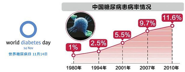 目前,我国是糖尿病患者最多的国家,据2013年权威部门发布的调查报告显示:中国成年人处于糖尿病前期人数占总人口的50.1%,糖尿病患病率为11.6%。这相当于每两个成年人就有一个属于糖尿病前期;10个成年人中就有一个糖尿病患者。