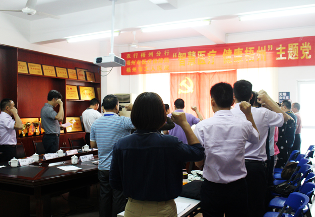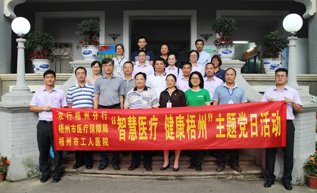 5月24日下午,农业银行梧州分行党委、梧州市医疗保障局党组联合梧州市工人医院党委联合开展“智慧医疗 健康梧州”主题党日活动。