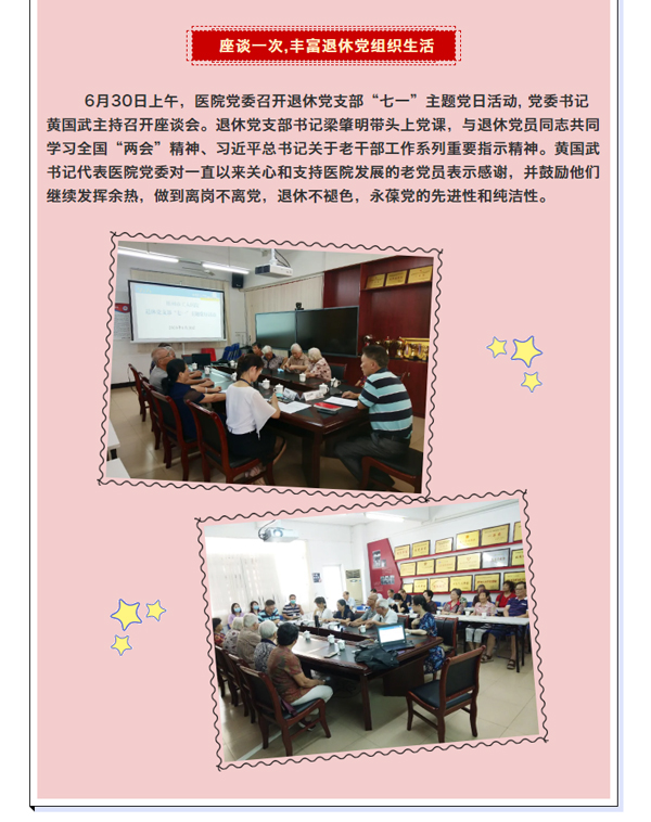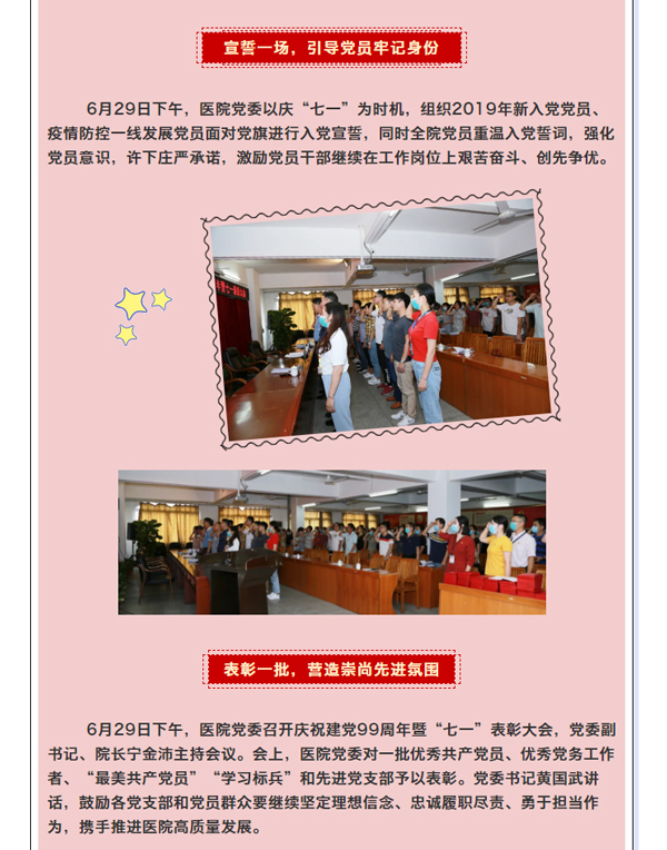 为庆祝中国共产党建党99周年,市工人医院党委精心筹划部署,组织开展了主题鲜明、内容丰富、形式多样的系列活动。