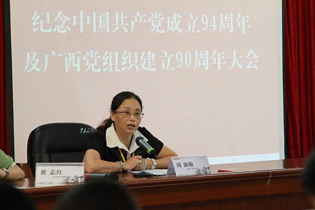 6月24日下午,我院在分部礼堂召开了纪念中国共产党成立94周年及广西党组织建立90周年大会。会议由党委副书记、院长黄志红主持,全院共产党员、积极分子两百余人参加了会议。