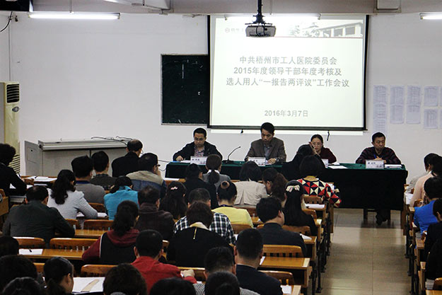3月7日,院党委召开2015年度领导干部年度考核及选人用人“一报告两评议”工作会议。市卫计委党委派出副书记、副主任甘秀天和党办主任候传北同志作为考核组到会指导。全体党委委员、中层干部参加。