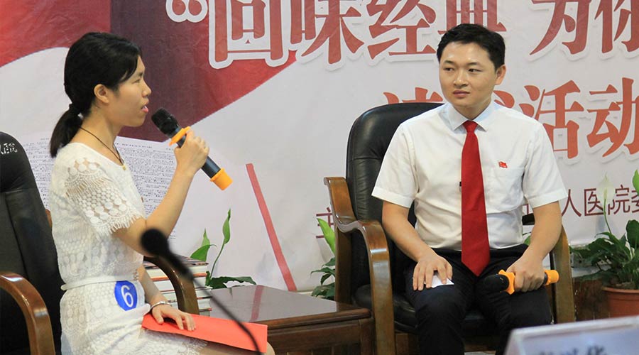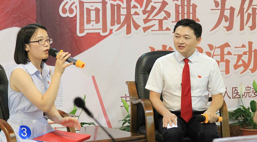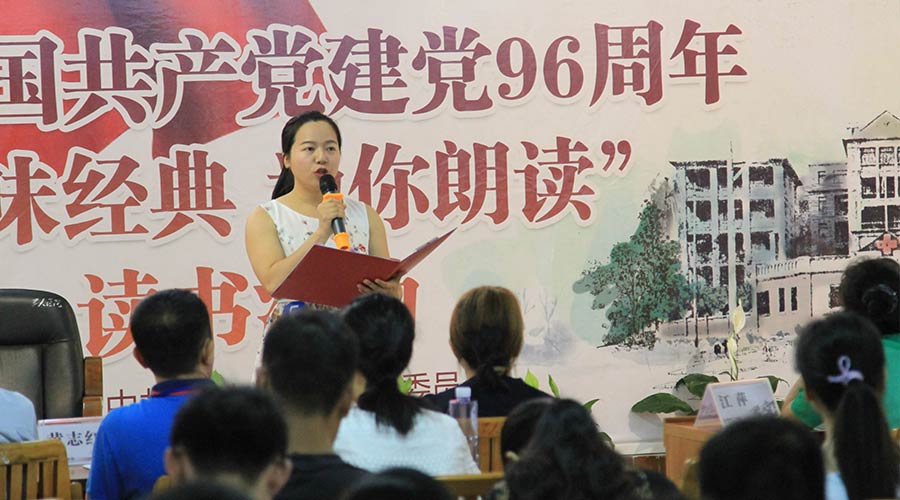 (门诊党支部的李慧敏同志在朗读冯骥才的《珍珠鸟》一文)