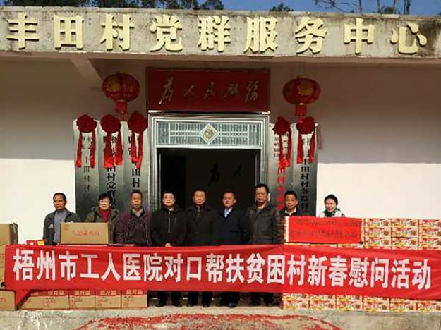 2月8日、9日连续两天,梧州市工人医院派出扶贫小分队分别到苍梧县岭脚镇丰田村、龙圩区新地镇思贤村进行春节走访慰问。