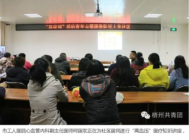 当天下午,在大东社区门前,青年志愿服务队忙碌地为前来咨询的社区居民进行义诊,认真地倾听居民提出问题,熟练地为居民测量血压,为老人免费检查身体,医护青年志愿者还提供专业的医疗意见,在寒冷的冬日温暖了居民老人的心。而在大东社区内,市工人医院心血管内科副主任医师何国欢正在为社区居民进行“高血压”医疗知识讲座,何医生用风趣的“梧州白话”,深入浅出地为居民介绍了高血压的病症,如何预览高血压等等医疗知识。